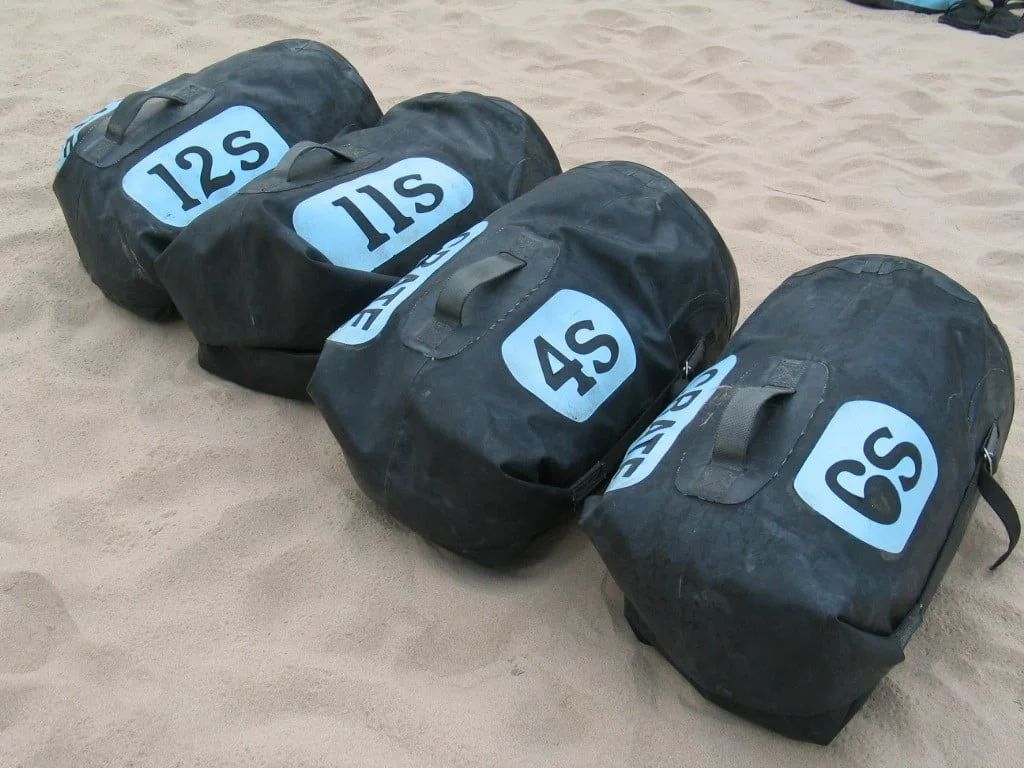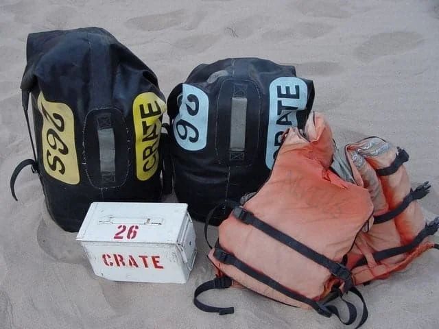 Waterproof bags are provided for clothing, personal items, and sleep gear. Quantity and size vary by trip, with Alaska trips using one large bag and one smaller sleep-kit bag.