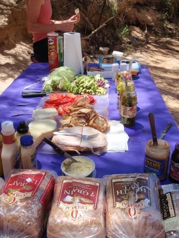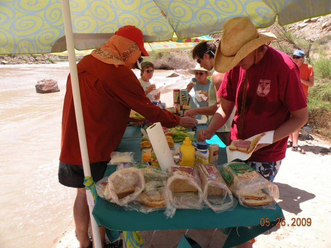 Your day on the river includes a delicious sandwich bar lunch with all the trimmings. The array and variety of cold cuts and vegetables, not to mention good old PB & J, will satisfy the heartiest appetites. Cold water and lemonade are available at all times on the raft and at lunch. (One-Day Utah Trip only)