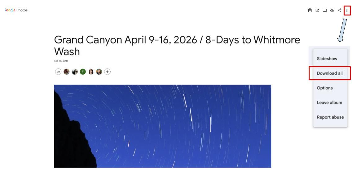 - To download the whole album: Look for the "More" menu (three dots) in the top right corner and select "Download All." This will save a zip file of every photo in the album to your device.